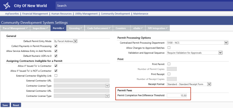 A Permit Completion Fee Difference Threshold field has been added to the Permits tab on the Community Development System Settings page. Use this field to set a threshold dollar amount for the difference between the total fees applied to a permit and the total fees collected in excess of the fees applied.