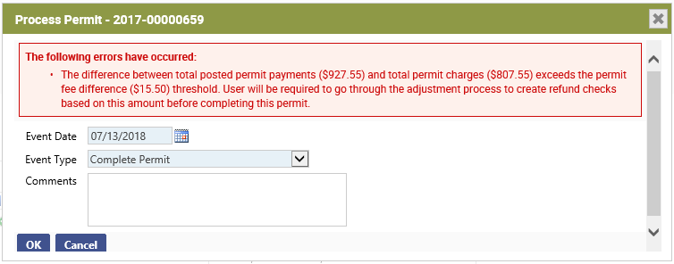 Attempting to complete or cancel a permit when the amount collected exceeds this threshold will require an adjustment to be processed (see "Process Permit" below).