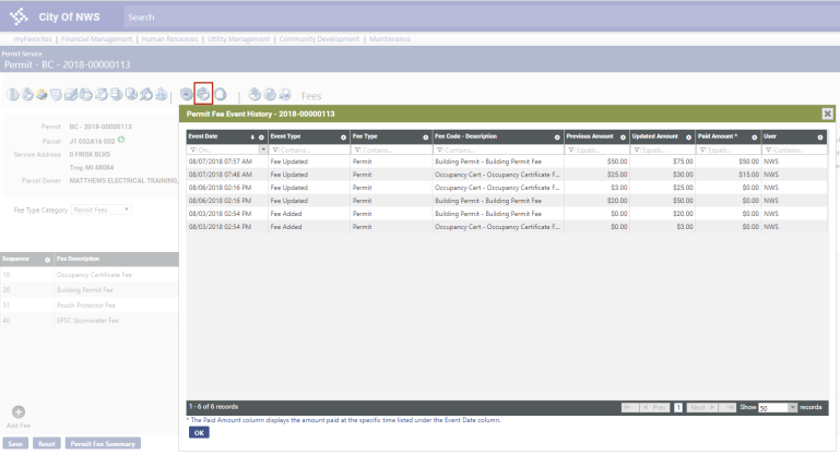 Community Development > Permits > Permit Service > Edit Permit > Fee Event History