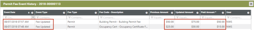 A row, or line item, is created for each fee event type shown in the Event Type column. Each time a fee is added, updated or removed, a row is added to the top of the grid, showing the Previous Amount and the Updated Amount. The Paid Amount column shows the amounts paid at the corresponding times listed in the Event Date column; for example, in the image below, the grid shows that a Building Permit Fee was updated from $50 to $75 on 08.07.18 at 7:57 a.m., and at the time of the update, $50 had been paid on the fee. It also shows that an Occupancy Certificate Fee was updated from $25 to $30 on 08.07.18 at 7:48 a.m. and that $15 had been paid on it: