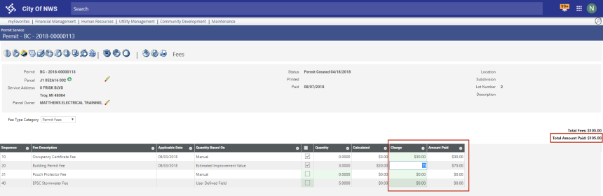 Community Development > Permits > Permit Service > Edit Permit > Fees