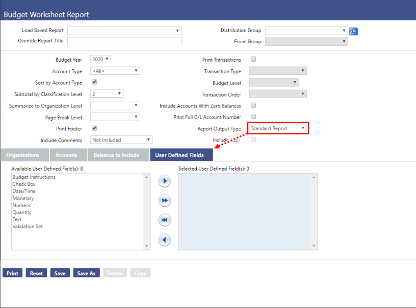 As part of this enhancement, the User Defined Fields tab has been added to the Budget Worksheet report criteria page. This tab contains two jump boxes. The Available User Defined Field(s) box populates with all the available user defined fields. To include one or more of these fields on the budget worksheet standard report, simply move the desired field(s) from the Available User Defined Field(s) box to the Selected User Defined Field(s) box, and then click Save.