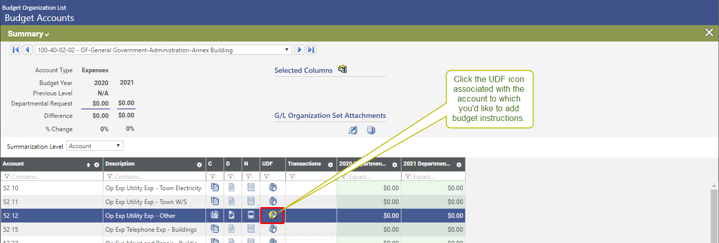 In the Budget Accounts grid, locate the account to which you would like to add budget instructions. In the account’s UDF column, click the