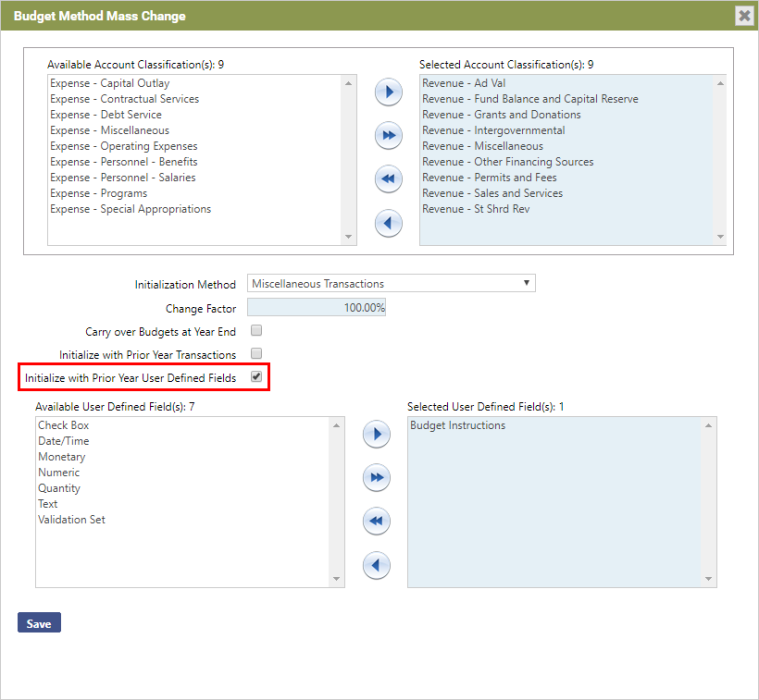 When the Initialize with Prior Year User Defined Fields check box is selected, two jump boxes appear below the check box: Available User Defined Field(s) and Selected User Defined Field(s).