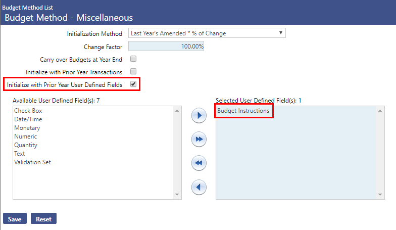 This functionality had been added to Budget Methods. Budget Methods allow users to determine the starting values for initializing budgets, such as the initialization method and change factor. In the current release, the Budget Method page has been enhanced with the addition of the Initialize with Prior Year User Defined Fields check box. For a given budget method, this control gives users the ability to select which UDFs will carry forward from year to year.