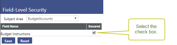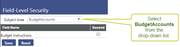 The Field-Level Security table will populate with all of the user defined fields that have been created for the BudgetAccounts subject area. In our example below, this is limited to one field, Budget Instructions.