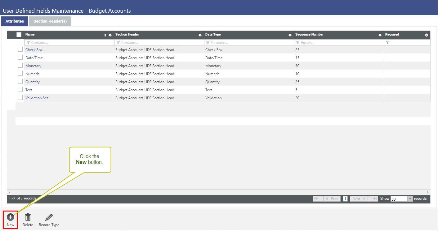 The User Defined Fields Maintenance - Budget Accounts page will open. This is the maintenance page for all user defined fields available to the budget accounts record type. Here we will create a new field called Budget Instructions.