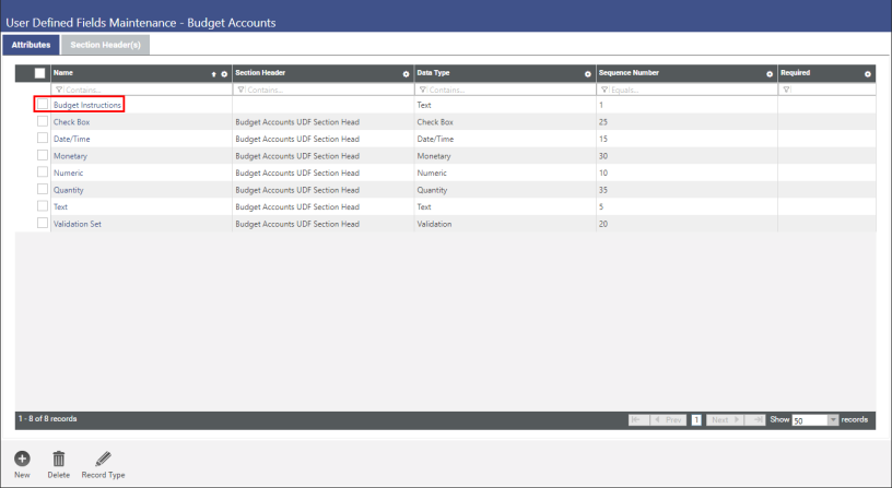 The User Defined Fields Maintenance - Budget Accounts page will refresh to include the newly created Budget Instructions user defined field.