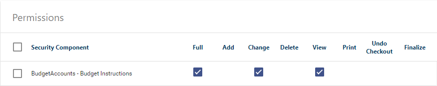 Now that the Budget Instructions field is secured, the security component BudgetAccounts-Budget Instructions will be available in User Permissions.