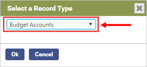 The Select a Record Type pop-up window will open automatically. Select the Budget Accounts record type from the drop-down list, and then click Ok.