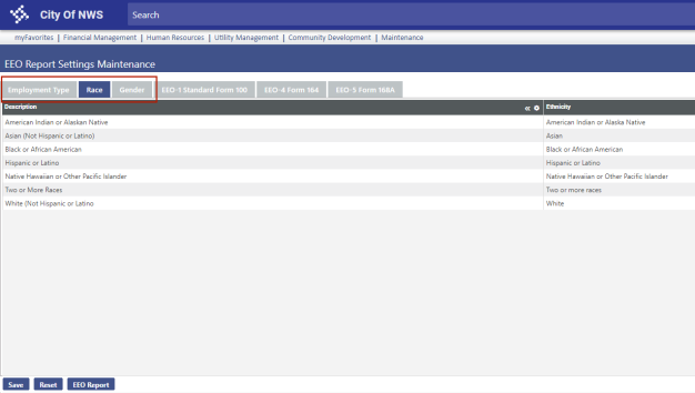Employment Type, Race and Gender tabs on the EEO Report Settings Maintenance page.