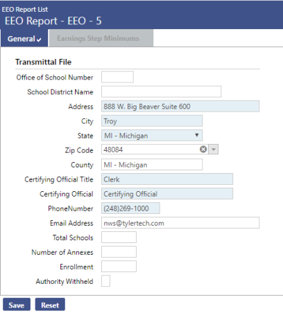 The CODE ID for Form 168A is 5. Click this ID to open the EEO Report-EEO-5 page and set up your transmittal file information on the General tab: