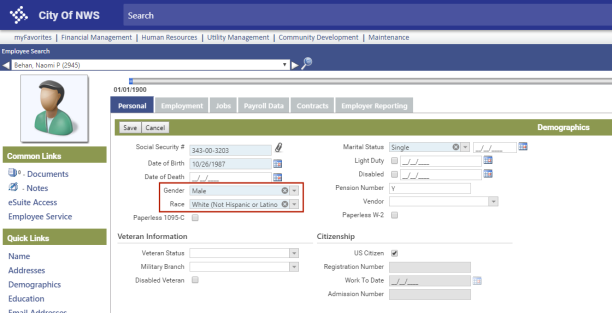 Personal tab (corresponds with Gender and Race tabs in EEO Report Settings Maintenance) -