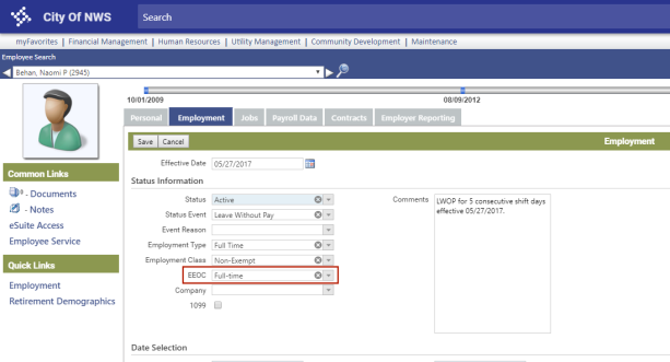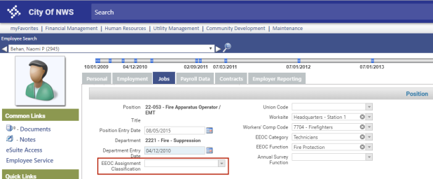 To appear on the EEO-5 Form 168A report, employees need to have selections in the following fields in Workforce Administration: