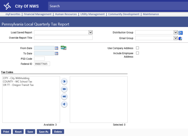 Selected Local Service Taxes, has been moved to a new page, where you may run the Local Services Tax Report separately for one or multiple employers.To run the Local Services Tax Report, navigate to Human Resources > State Requirements > PA > Local Services Tax Report. Click here for more information on this new menu option.