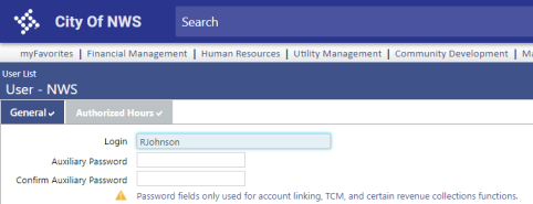 The password fields on the General tab of the User page have been renamed Auxiliary Password and Confirm Auxiliary Password and are maintainable again. Users also may change their own auxiliary passwords on the My Settings page. On the Void Receipt, Void Batch, and the Receipt entry pages (multi-cashier batch only), users should enter their NWERP username and auxiliary password. Note the NWERP username now shows on the profile card in parentheses next to the user's display name, since it could be different from the TID username. |