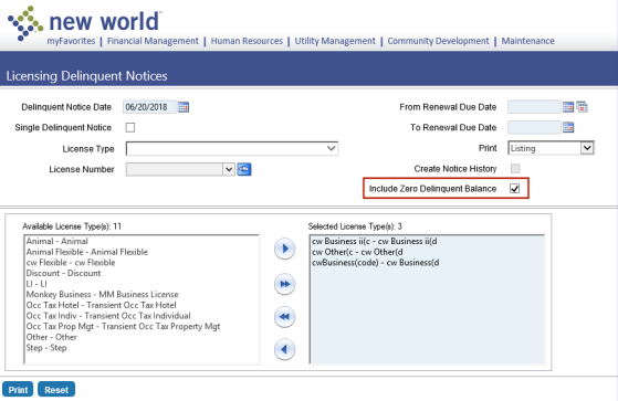 A licensee with a $0.00 balance was appearing on the Licensing Delinquent Notices Listing. To give users the option to have the listing include or exclude accounts with $0.00 balances and delinquent fees, an Include Zero Delinquent Balance check box has been added to the Licensing Delinquent Notices page. |