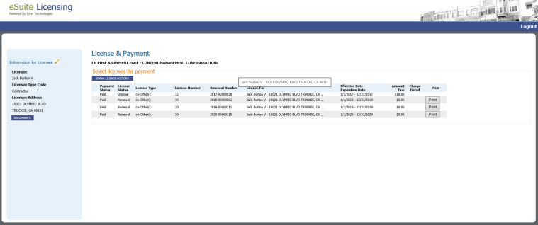 On the Select licenses for payment grid, the user is able to view the licensee's city, state and zip on a tooltip. |