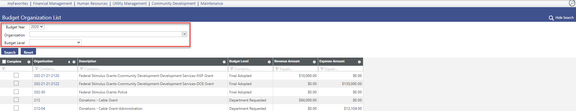 | Financial Management | Annual Budget Processing | Budget Organization List - Show Search - The Show/Hide Search function, located at the top of the page, has been modified to default to "Show." (Financial Management > Annual Budget Processing > Budget Processing > Budget Maintenance) | NA | Enhancement | NWERP-67998 |