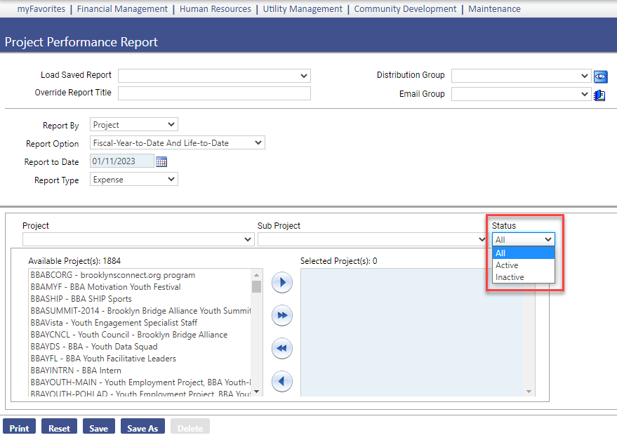 | Financial Management | Project Accounting | Project Accounting Reports - A new Status filter has been added to the Project Accounting reports' selection page, which allows users to filter the list of projects that appear in the "Available" section of the Projects jumpbox. The available options are: All, Active and Inactive. (Financial Management > Reports > Project Accounting) | NA | Idea | NWERP-67961 |