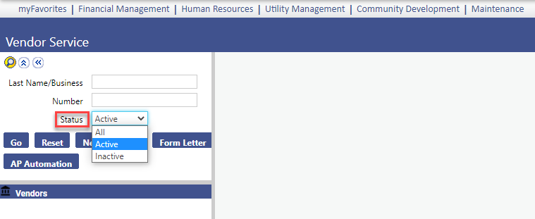 | Financial Management | Maintenance | Vendor Service/Vendor Inquiry - The "Status" dropdown has been added to the Search section and replaces the "Active" checkbox on the Advanced Search pop up. This enhancement will allow users to easily filter vendors by their "Active/Inactive" status. The default values for these pages are consistent with their current functionality. Vendor Service defaults to "Active." Vendor Inquiry defaults to "All." (Maintenance > new world ERP Suite > Procurement > Vendor Service/Financial Management > Inquiries > Vendors) | TBD | Enhancement | NWERP-67927 |