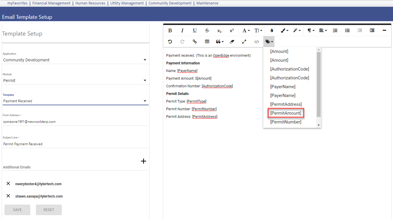 | Community Development | ePermits | To display the permit amounts on emails for payments received, a PermitAmount tag has been added to the Payment Received template in Email Template Setup. (Maintenance > new world ERP Suite > System > Email Template Setup) | 9963601 | Enhancement | NWERP-68311 |