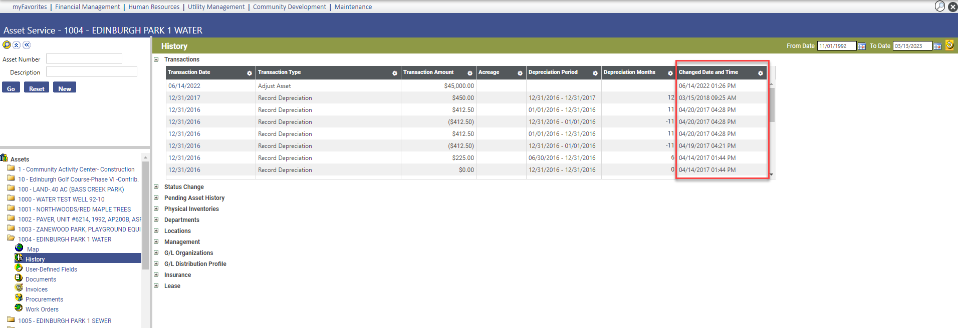 | Financial Management | Asset Management | Asset Service - History - The "Changed Date and Time" column has been added to the "Transactions" grid to allow users to view the date the transaction occurred and sort transactions in chronological order. (Financial Management > Asset Management > Asset Service > Go > History > Transactions) | NA | Enhancement | NWERP-68284 |