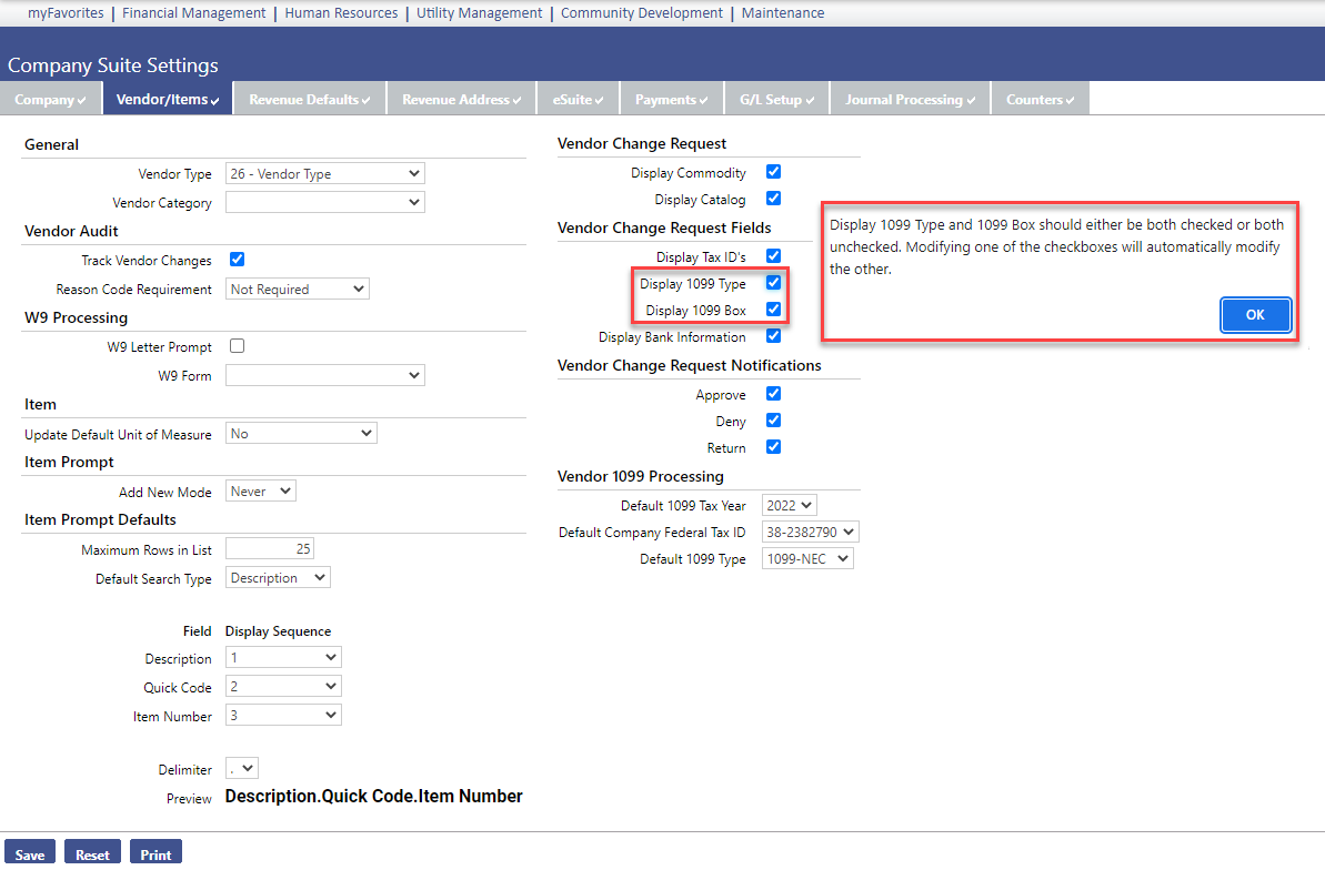 | Financial Management | Procurement | Vendor Change Request - Company Suite Settings>Vendor/Items Tab - The option to "Display 1099 Type" or "Display 1099 Box" will now require both boxes to be checked or unchecked. (Maintenance > new world ERP Suite > System > Company Suite Settings > Vendor/Items) | NA | Enhancement | NWERP-68248 |