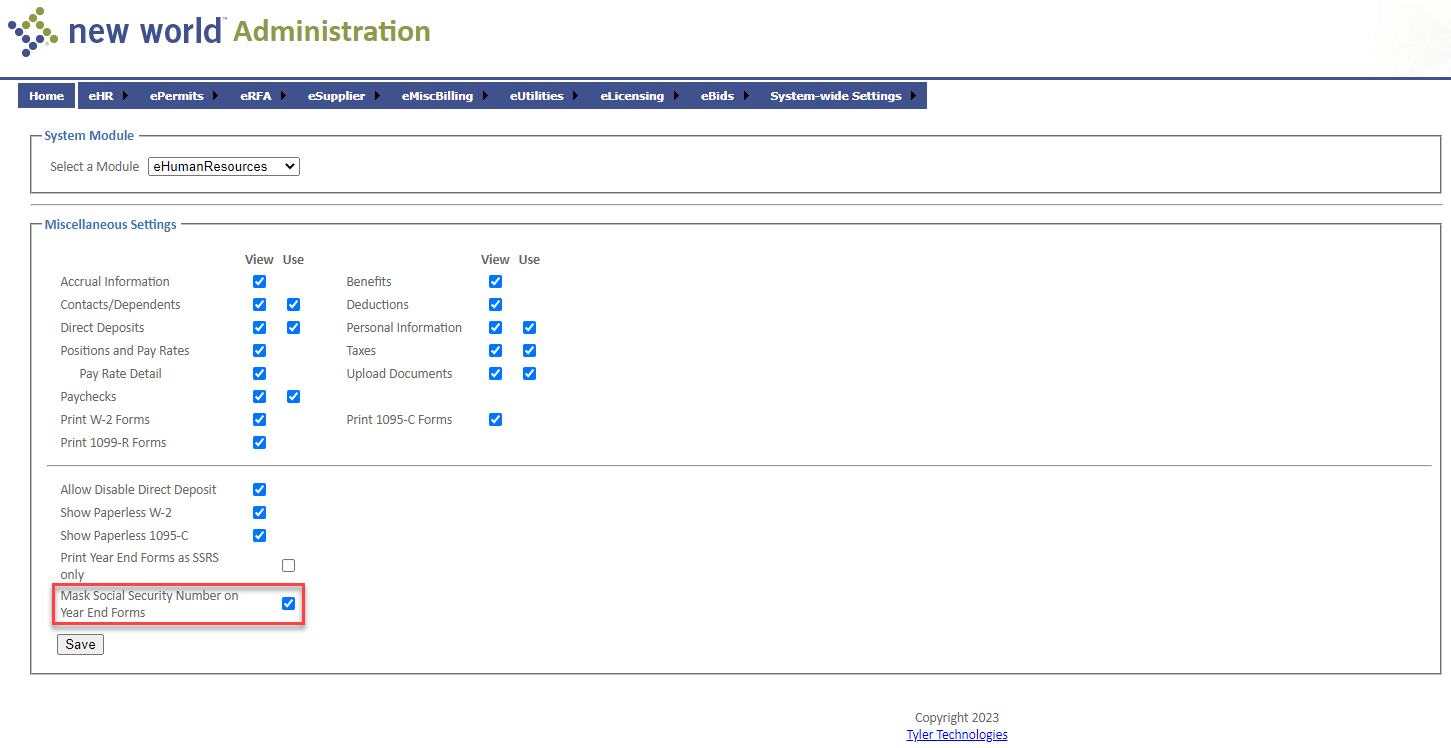 | Human Resources | Year-End Processing | Social security numbers can be masked on 1099-R forms downloaded from eSuite. (eAdministration > eHR > eEmployee > Miscellaneous Settings) | NA | Enhancement | NWERP-68220 |