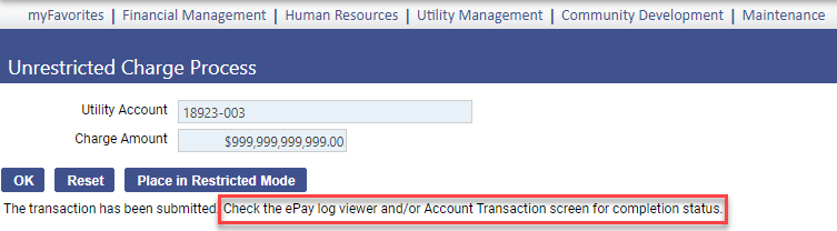 | Utility Management | Billing | The exception charges message has been modified to direct users to the ePay log viewer to review possible errors. (Utility Management > Credit Card Payments > Exception Card Process > Place in Unrestricted Mode) | 9753058 | Enhancement | NWERP-68317 |