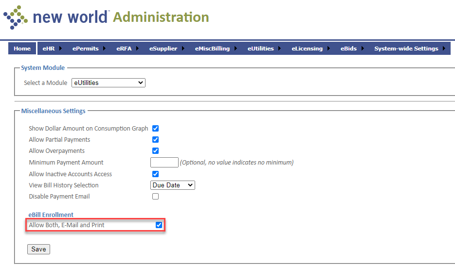 | Utility Management | eUtilities | A setting to enable enrollment in eBills and printed bills has been added to eSuite Administration for eUtilities. (eAdministration > eUtilities > Miscellaneous Settings) | NA | Enhancement | NWERP-68306 |