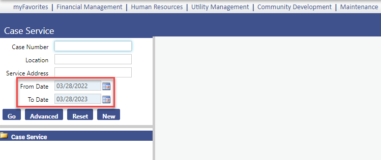 | Community Development | Cases | From Date and To Date fields have been added to the basic search section in Case Service, giving the user the option to expand the date range of a search without having to use the advanced search. The default range is one year. (Community Development > Requests for Service > Case Service) | NA | Enhancement | NWERP-68351 |