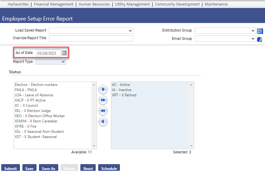 | Human Resources | Reports | The Employee Setup Error Report may be run without an As of Date. (Human Resources > Reports > Employee Reports > Employee Setup Error Report) | NA | Enhancement | NWERP-64962 |