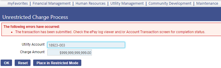 | Utility Management | BillingX | The exception charges message has been modified to direct users to the ePay log viewer to review possible errors. (Utility Management > Credit Card Payments > Exception Charge Processing > Place in Unrestricted Mode) | 9753058 | Enhancement | NWERP-68452 |