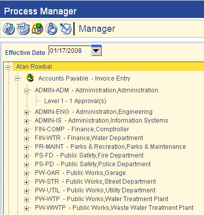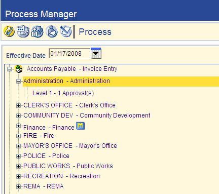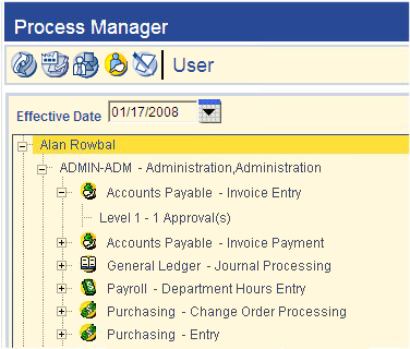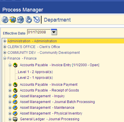 The Process Manager is used to set up the process or departments to which a user will be authorized and denote the level at which the user can approve transactions. This can be done using one of the four views that are available based on the user’s security level:
