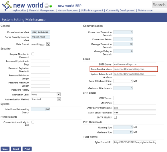 System Settings Maintenance (Maintenance > new world ERP Suite > System > System Settings), but you may override it on the Email Template Setup page.
