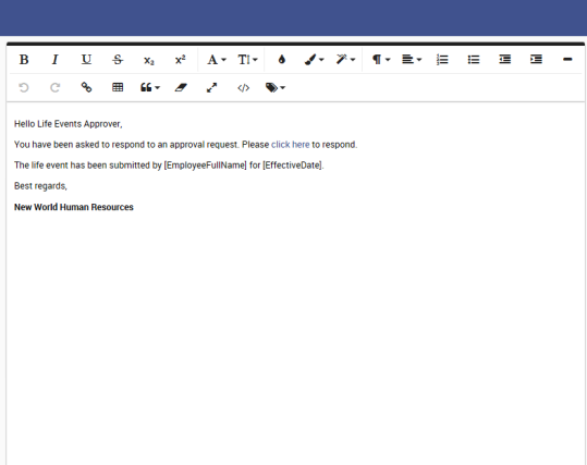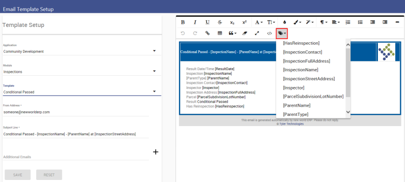information placeholders used to populate emails linked to the template. Any placeholder may appear multiple times in the template. Within the body of an email, only the items selected from the drop-down are replaced with system-generated text.