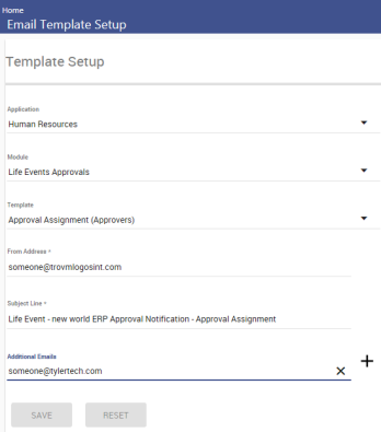 The Additional Emails field in the Template Setup panel also is enabled to let you add the email addresses of those who should receive the email in addition to recipients included in the process. To add an address, type it in the field, and click the plus (+) button. The address displays below the field, and the field clears for the entry of another address. .