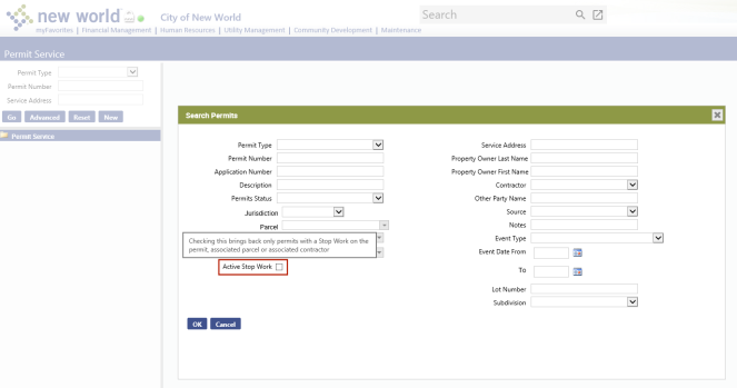 An Active Stop Work check box has been added to the ClosedSearch Permits dialog in Permit Service.