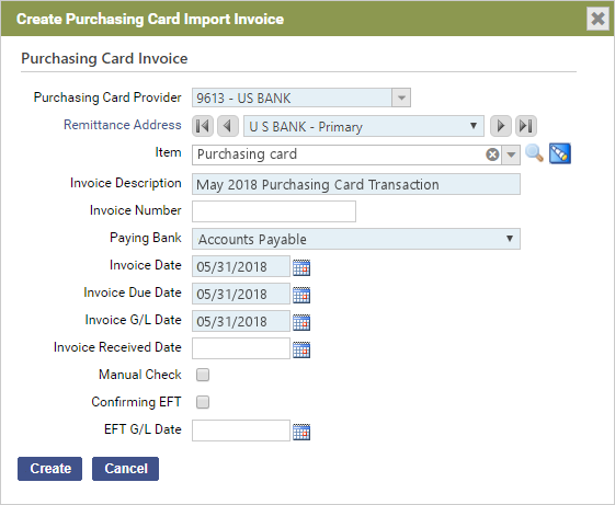 The Create Purchasing Card Import Invoice pop-up window will open. The information in this window represents the invoice you will ultimately use to pay the purchasing card provider. Entry fields in this window are populated automatically based on values entered via the import wizard.