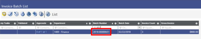 The Invoice Batch List page will open. In the grid, locate and click on the purchasing card invoice batch you created in the previous step.