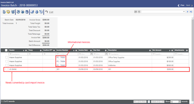 The Invoice Batch page will reopen with your newly converted purchasing card import invoice listed in the grid.