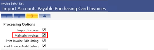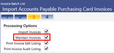 Note: The Maintain Invoices check box is cleared by default. When it is cleared, the purchasing card import works exactly as it does in earlier releases of the software, importing the batch as a normal purchasing card batch.