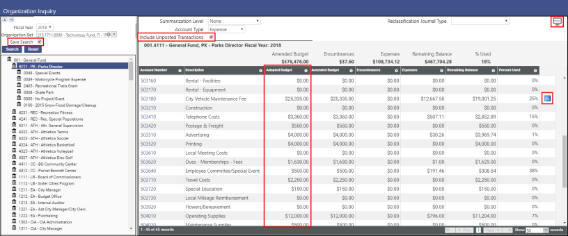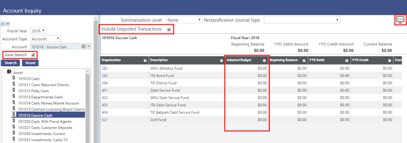 - Saving searches. The ability to save a search has been added. This allows users who typically run inquiries on the same G/L account, organization set, and/or account, to save their search criteria so that they don’t have to re-enter it for future inquiries. See Saving Searches below.