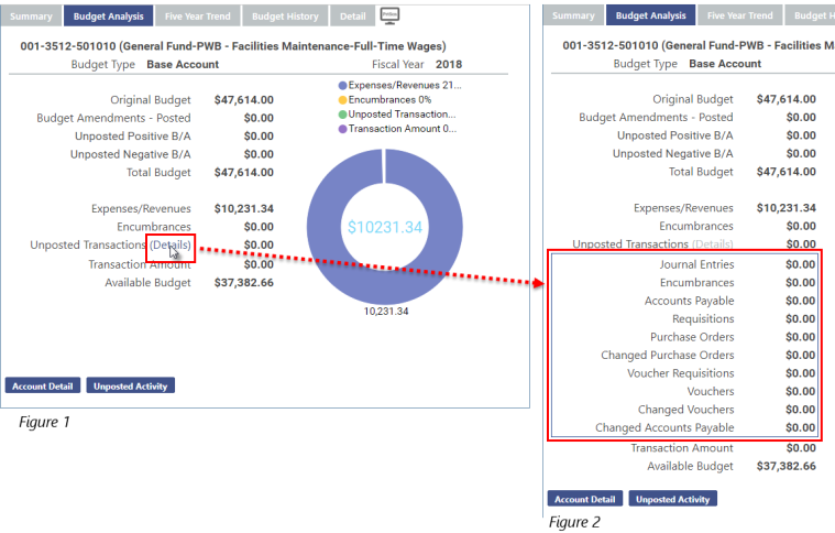 Some screens provide additional information through expandable areas, such as tables with rows that default as collapsed but can be expanded, or detail that displays only when a specific button is clicked. For example, the Budget Analysis tab (shown below) displays an Unposted Transactions amount and includes a “(Details)” hotspot that, when clicked, displays additional information.