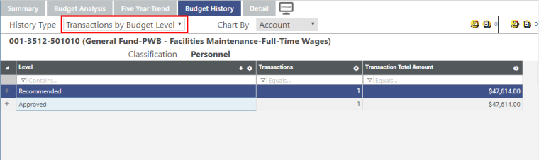 - The Budget History tab’s History Type field has been enhanced to default to Transactions by Budget Level instead of Amounts by Budget Level. See Budget History tab.