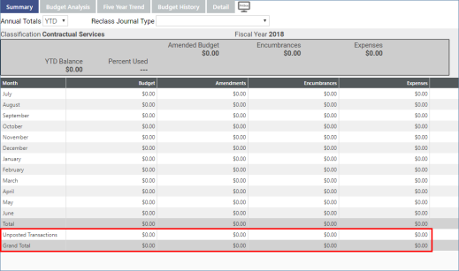 Since users need to view unposted transactions along with general ledger balances to properly analyze remaining balances, the Summary tab has been enhanced with the addition of two grid rows: Unposted Transactions and Grand Total.