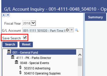 The Save Search check box has been added to the search criteria pane on the G/L Account Inquiry, G/L Organization Inquiry, and Account Inquiry pages (see example below). Selecting this check box allows you to save your current search, i.e., the values you entered in the search criteria fields.