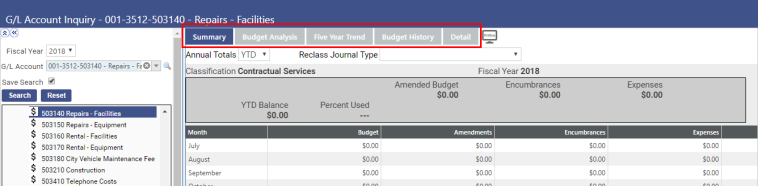 - Tab order. Tabs in the G/L Account Inquiry page have been reordered to display in the order of most often used. The new order is Summary, Budget Analysis, Five Year Trend, Budget History, and Detail. See Tabs Reordered for User Convenience.