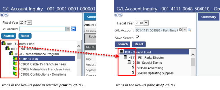 In 2018.1, the icons that represent organizations and accounts in the results pane of the G/L Account Inquiry, G/L Organization, and Account Inquiry pages have been replaced with “cleaner,” graphically unambiguous icons. This makes it easier to differentiate organizations from accounts in the results pane.